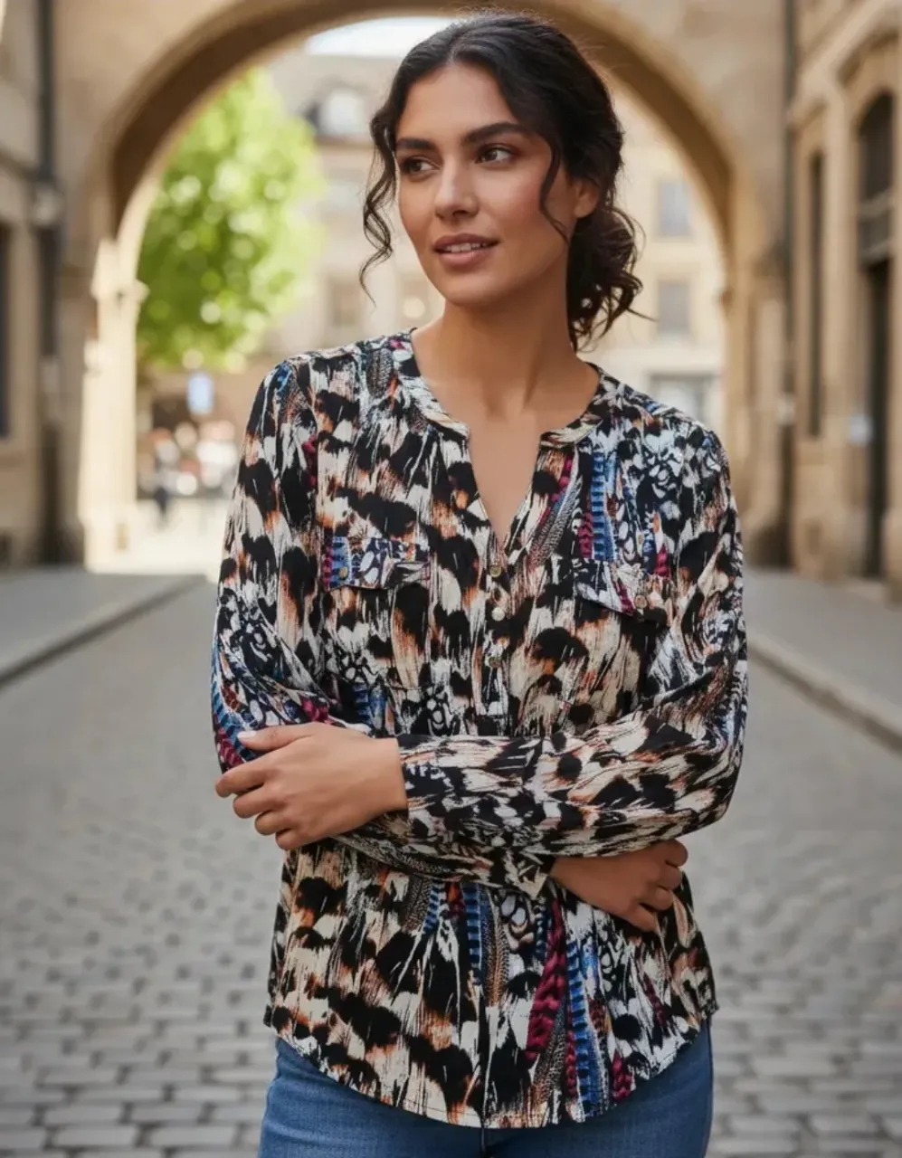 Camisa de manga larga de la marca italiana Motivi con estampa en tonos tierra, negro, blanco, azul y fucsia. Posee cuello escotado con botones y dos bolsillos delanteros con tapa y botón.