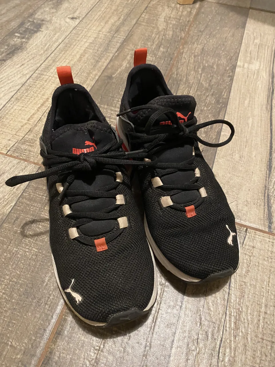 Zapatillas deportivas Puma negras con detalles en rojo y blanco. Ideales para entrenar o para un look casual y cómodo.
