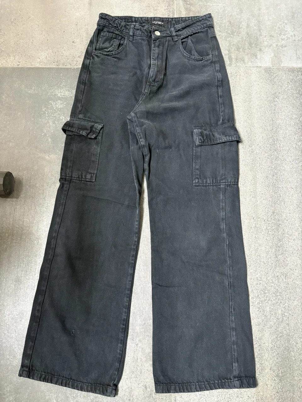 Pantalón de jean cargo color negro. Tiene bolsillos laterales con tapa y presillas.