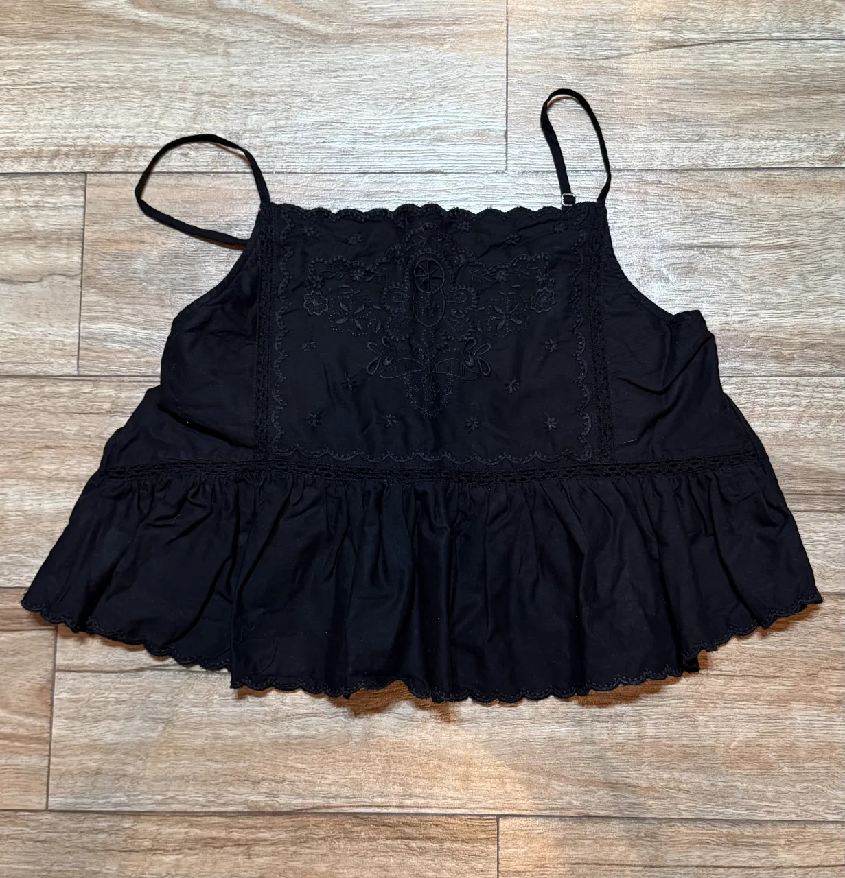 Top negro con tiras finas y detalles de bordado en la parte superior. Posee un borde festoneado en la parte inferior y en el escote.