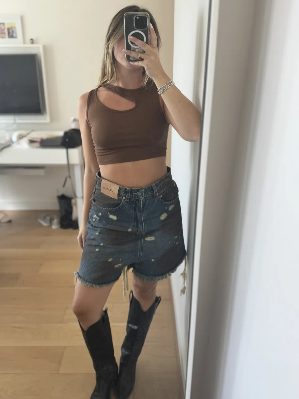 Musculosa marrón con recorte en el escote. Shorts de jean tiro alto con roturas y detalles desgastados.