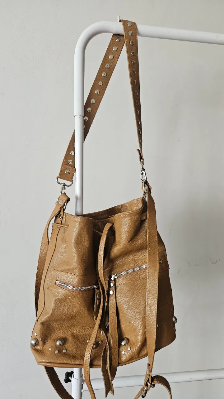 Carte bucket Lupita handbags, de cuero color suela con tachas plateadas. Tiene dos apliques de bolsillos frontales con cierre (solo decorativos) y una correa fija y otra correa regulable. forrada en el interior, con bolsillo interno y lazo porta llaves.