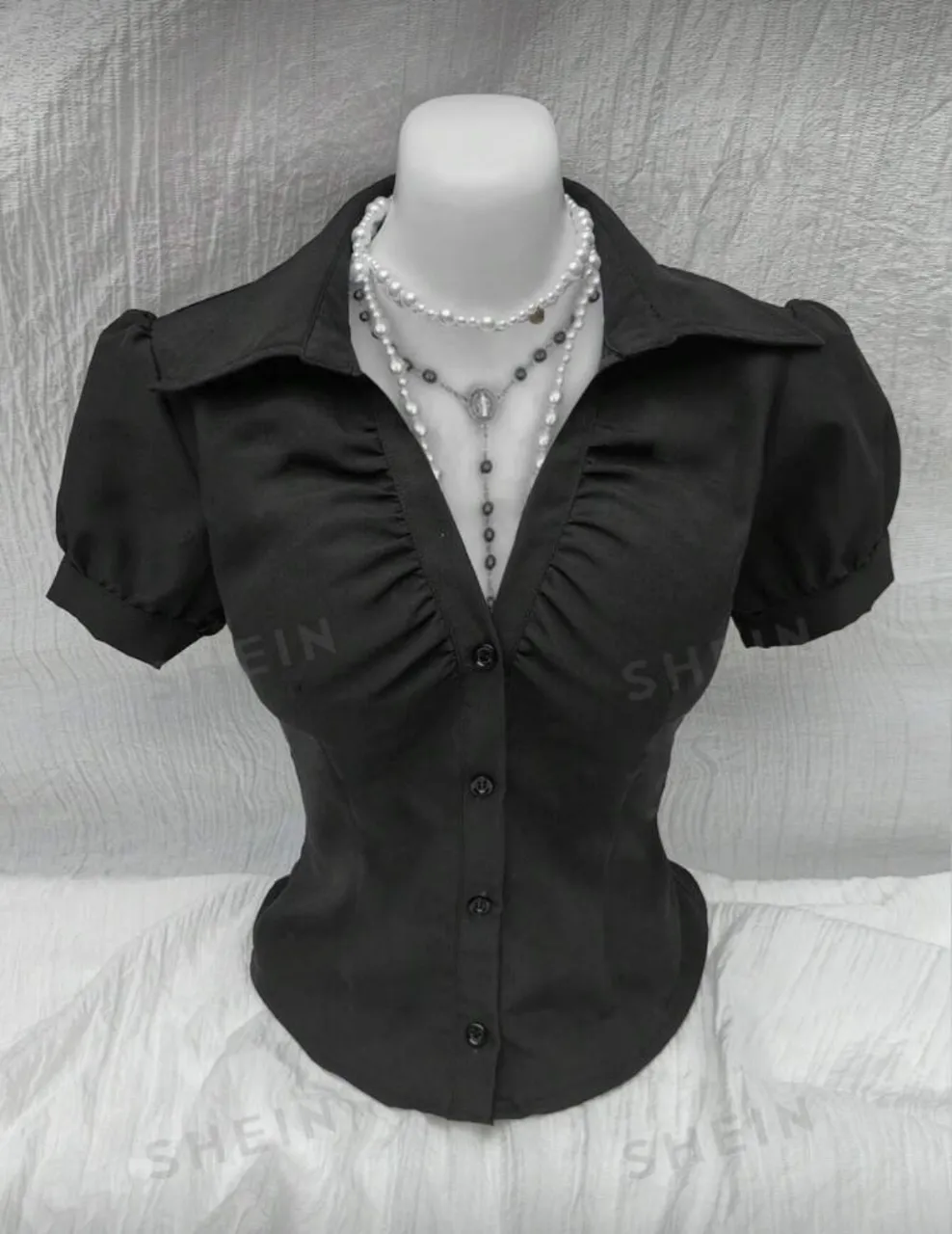 Blusa negra de manga corta con cuello camisero y detalles fruncidos en el frente. Un diseño elegante y versátil, perfecto para realzar tu figura. Ideal para combinar con pantalones o faldas para un look sofisticado.
