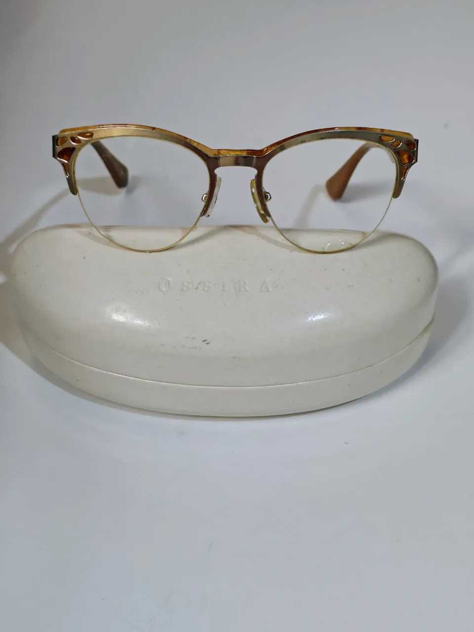 Armazón vintage para anteojos de metal dorado y acetato color carey, media montura, patillas planas flex. Ancho armazón de patilla a patilla 13 cm. Sin imperfecciones. En su estuche original