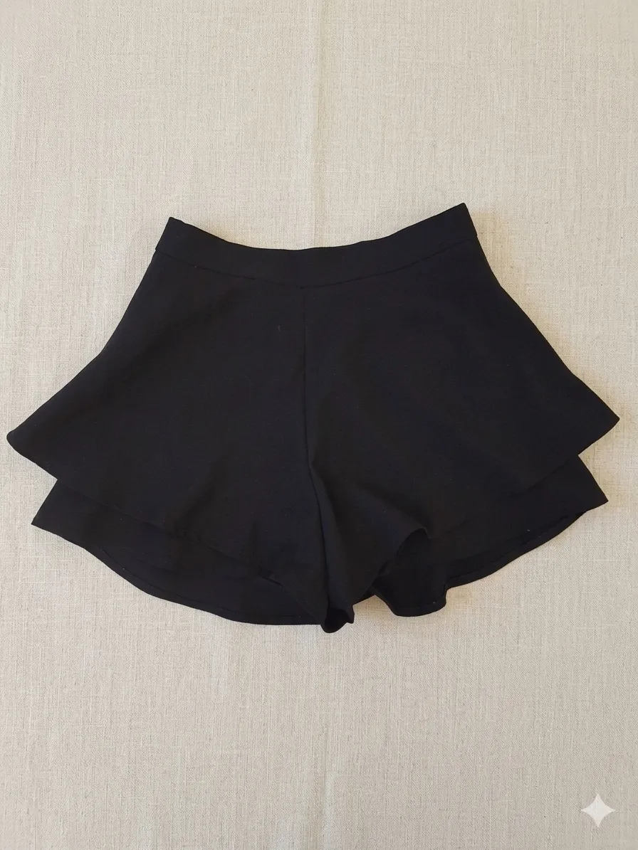 Shorts negros con diseño de falda superpuesta. Elegantes y modernos, ideales para un look sofisticado. cierre al costado.