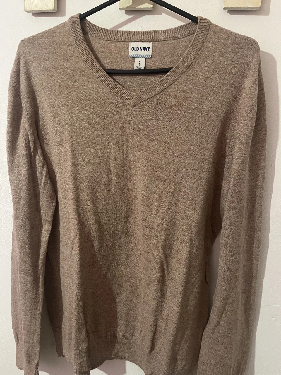 Sweater de lana color marrón claro, con cuello en V y mangas largas.