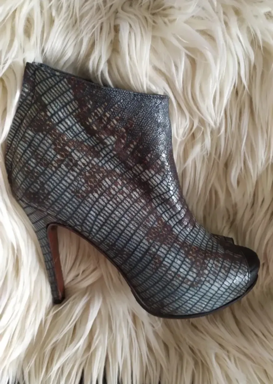 Botinetas de cuero taco alto con diseño texturizado y puntera boca de pescado. Forradas en cuero badana. El color es gris plomizo y marrón chocolate. Cuentan con cierre metálico en la parte trasera. Taco 12cm. Plataforma 4 cm. Suela Febo nueva. Soñadas! 💖