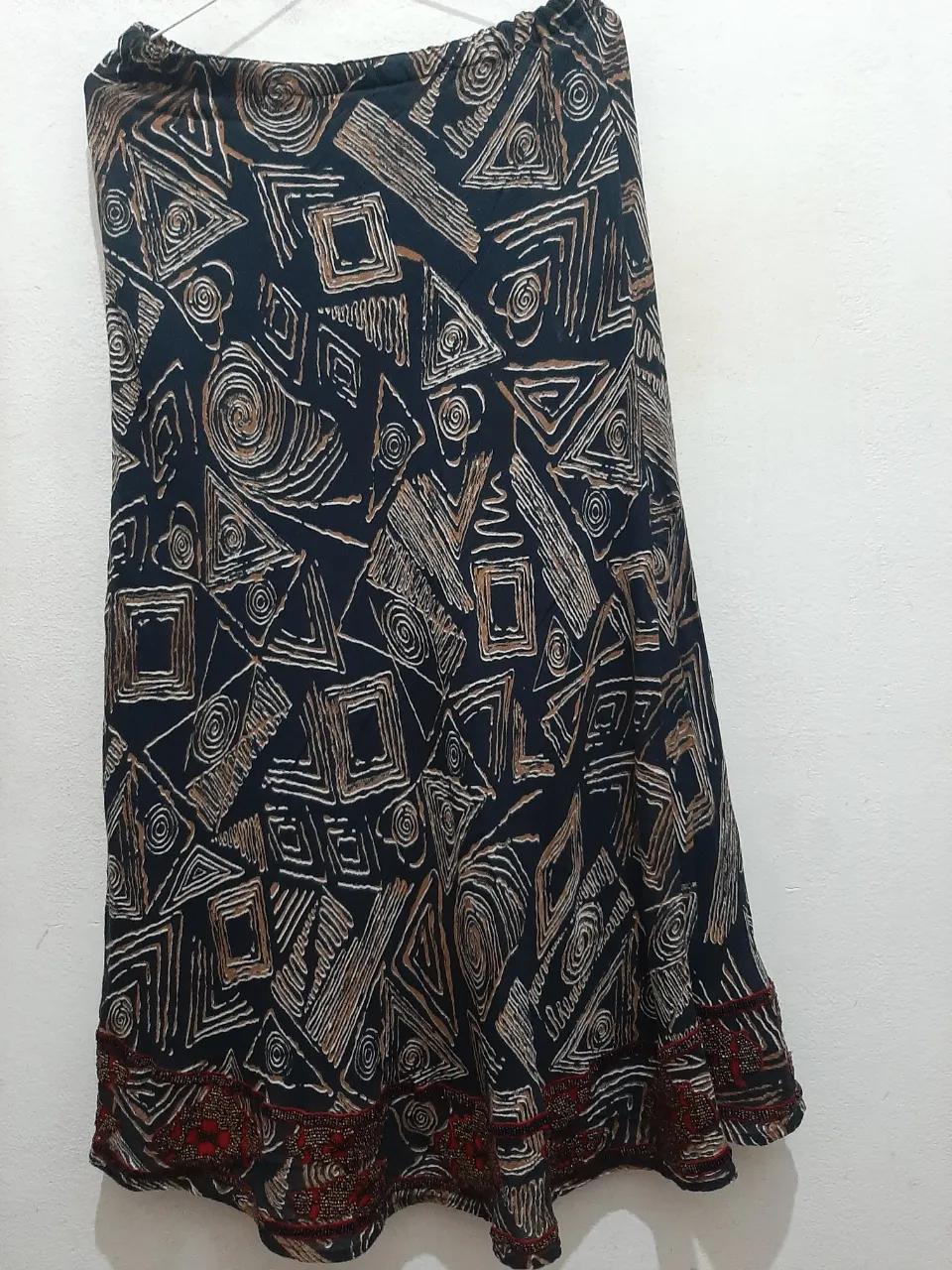 Pollera larga estampada con detalles bordados en la parte inferior. Diseño abstracto en tonos tierra y blanco sobre fondo azul oscuro. Ideal para un look boho chic o casual.