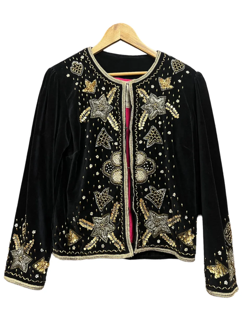 Chaqueta de terciopelo negra con bordados y lentejuelas doradas y plateadas. Un diseño único y llamativo, ideal para eventos especiales o para darle un toque de glamour a tu outfit.