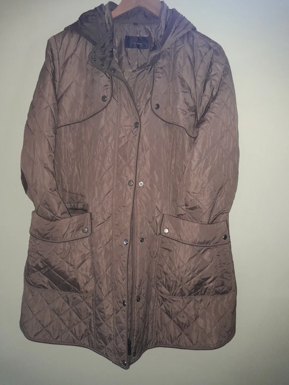 Campera matelaseada con capucha, color marrón. Posee bolsillos frontales y cierre con botones.