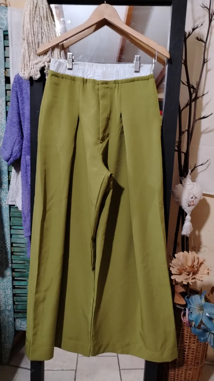 Pantalón ancho de color verde oliva, con cintura elastizada y detalles de pliegues en la parte delantera. Ideal para un look cómodo y canchero. Medidas 33cm ancho de cintura, 42cm ancho de cadera, 39cm largo de tiro, 1,06mts largo total