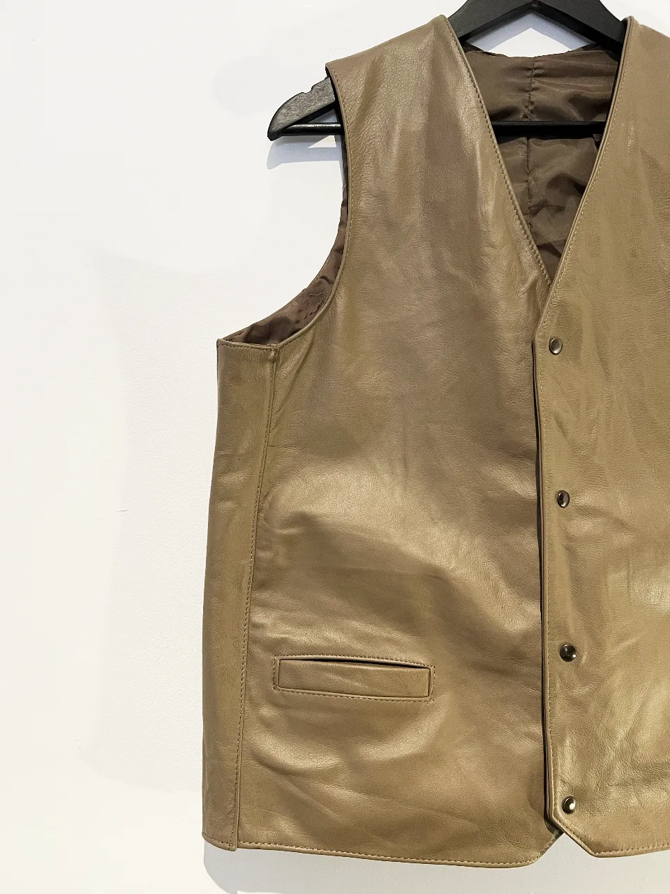 Chaleco de cuero color tiza, con botones al frente y bolsillos. Ideal para un look canchero y moderno.