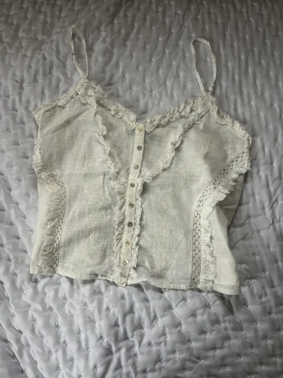 S tirando a M. Top/ remera blanca con botones al frente y detalles de volados y puntilla en el escote y los breteles. Posee bordado floral en la parte delantera.