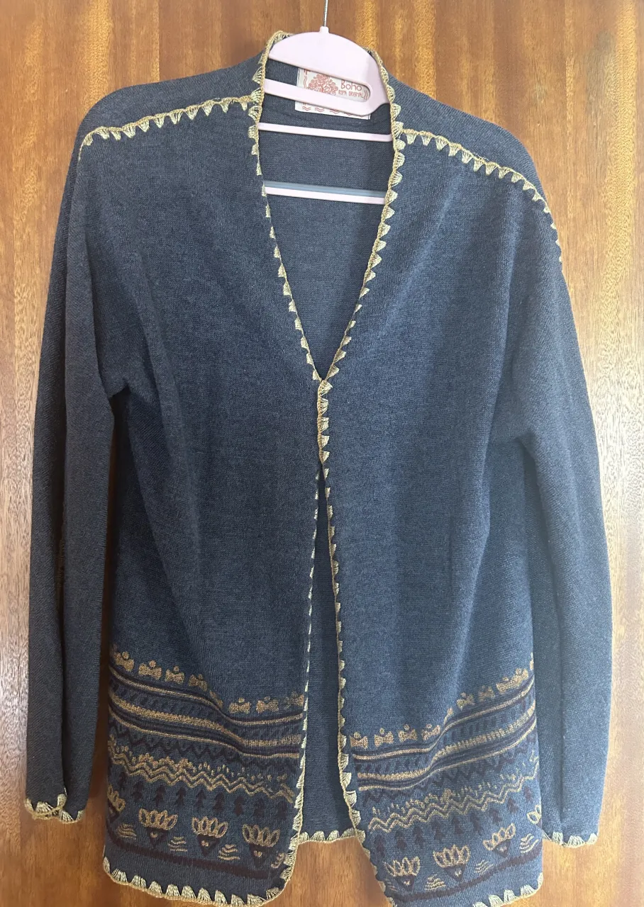 Cardigan de tejido fino, color azul, con detalles bordados en dorado y bordo en el cuello, puños y borde inferior. Posee un diseño étnico en la parte inferior.