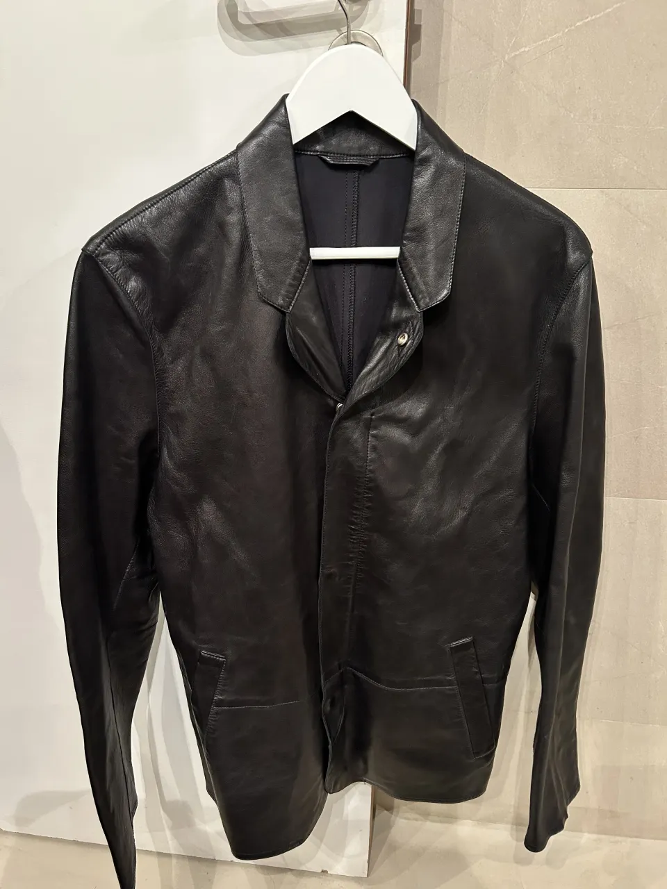 Campera de cuero negra con cuello solapa y cierre metálico. Posee dos bolsillos frontales con tapa.