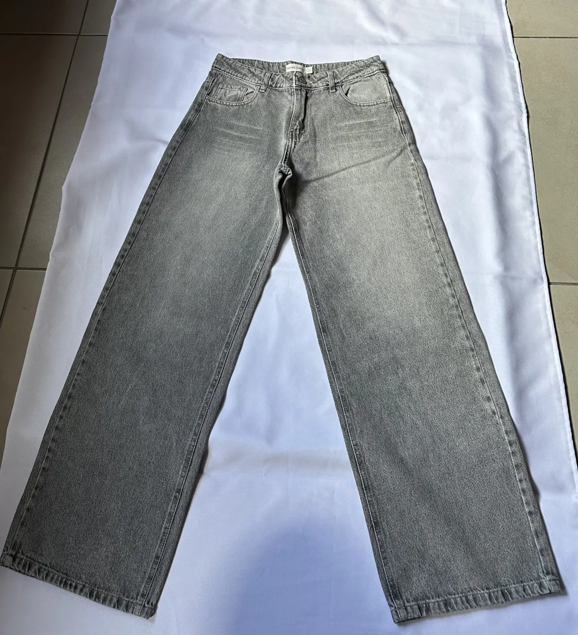 Jean de tiro alto, color gris. Posee bolsillos delanteros y traseros. Talle 42 Medidas aprox Cintura 40 cm Cadera 42 cm Largo 102 cm Tiro 26 cm