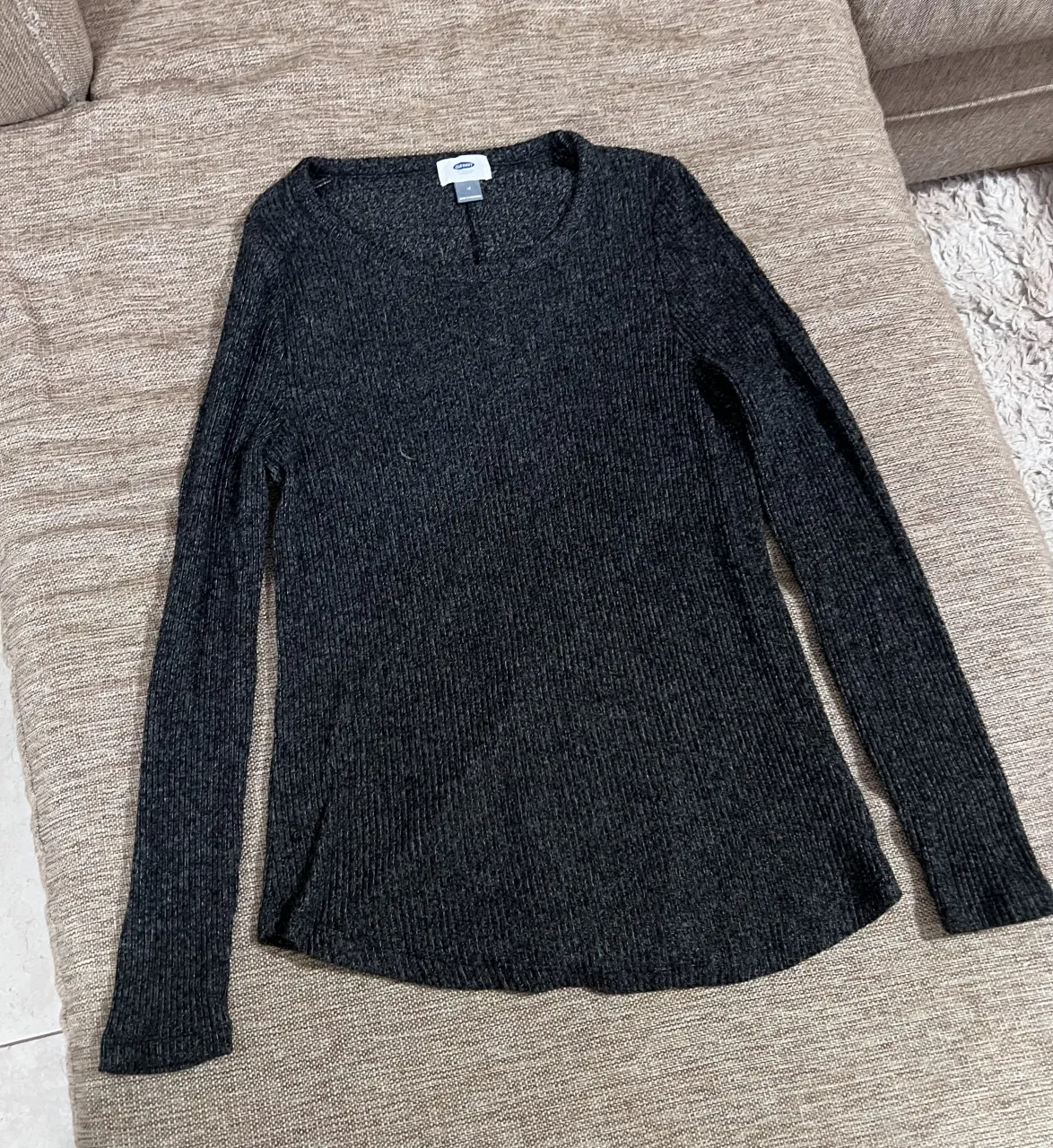 Remera de manga larga de tejido acanalado con cuello redondo. Presenta una pequeña abertura en la parte delantera del cuello.