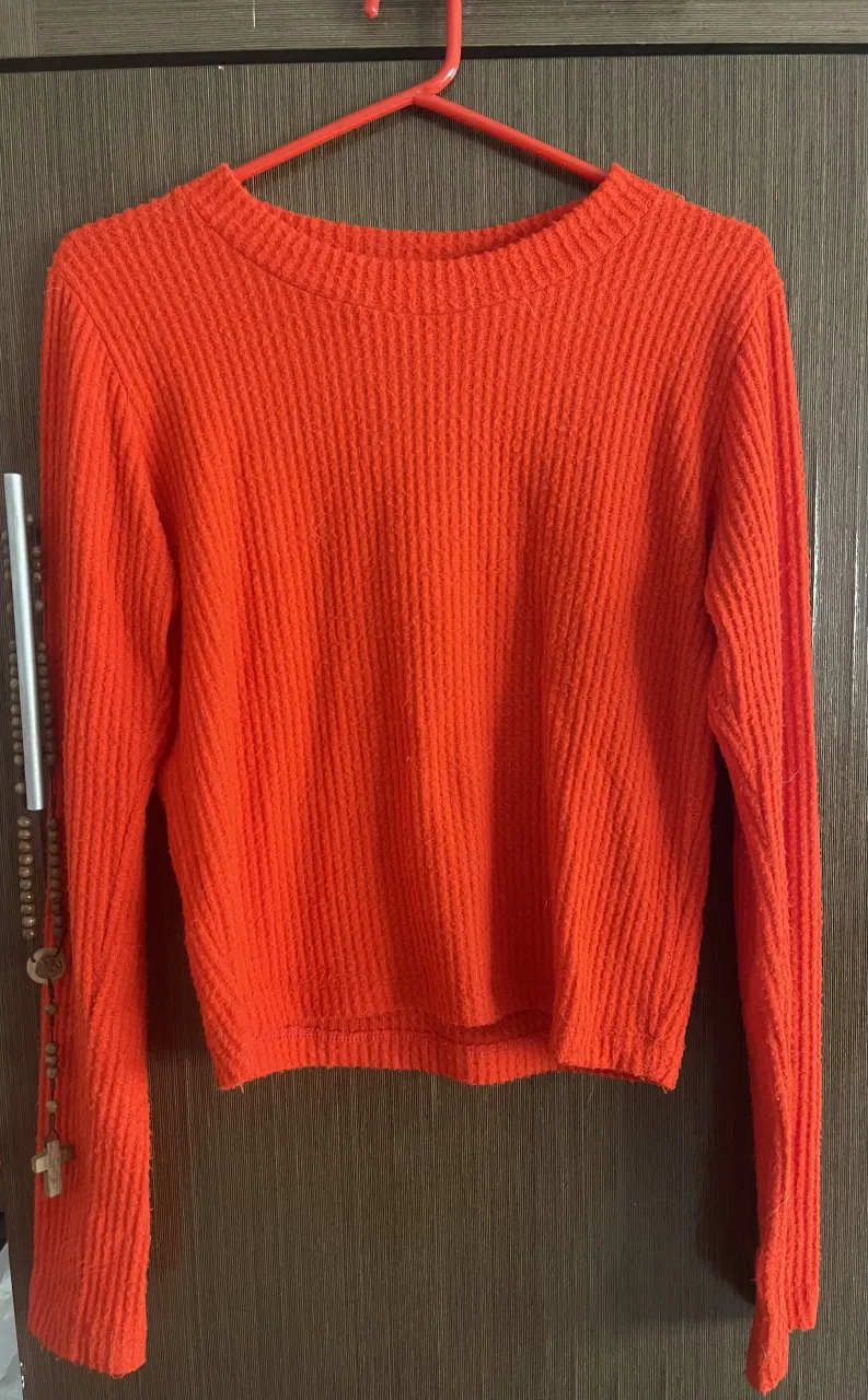 Sweater fino de color naranja vibrante. Posee cuello redondo y textura acanalada. Ideal para armar unos looks cancheroa este otoño.