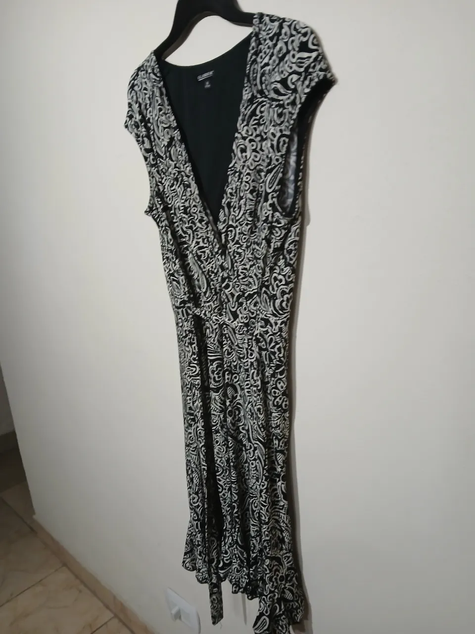 Vestido midi con estampado en blanco y negro. Diseño con escote en V y detalle de lazo en la cintura. Ideal para un look elegante y versátil.