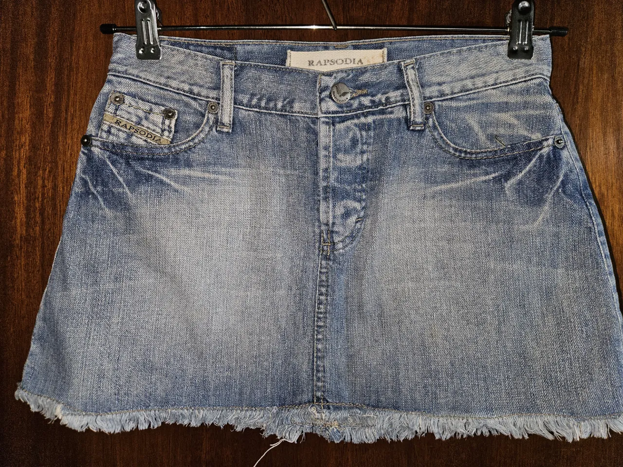 Pollera de jean tiro Bajo con roturas y detalles desgastados Rapsodia. Posee bolsillos y un corte desflecado en la parte inferior. Ideal para un look casual y moderno. Talle 26