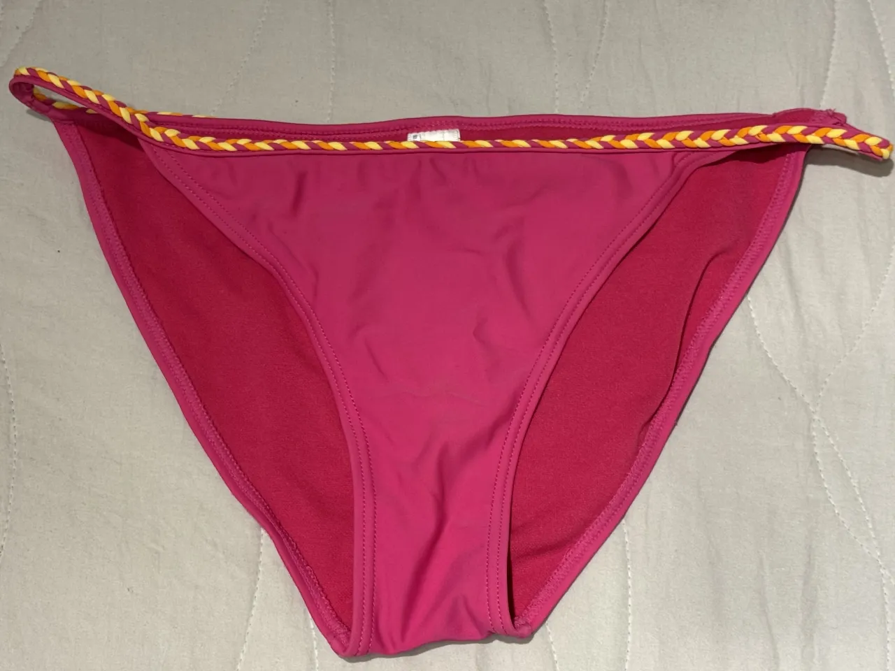 Bombacha de traje de baño color fucsia con detalle de trenza en la cintura en tonos amarillo y naranja. Ideal para disfrutar del sol y el mar con estilo. SIN USO!