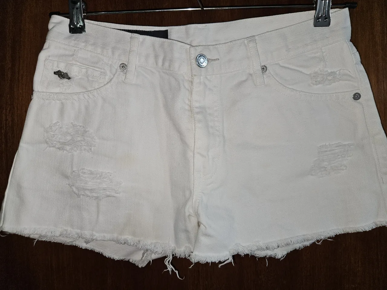 Shorts de jean blancos con roturas y detalles deshilachados en los bordes Armani Exchange. Un clásico para el verano, perfectos para un look casual y canchero. Tiene unas manchas amarillas del guardado en la última foto.
