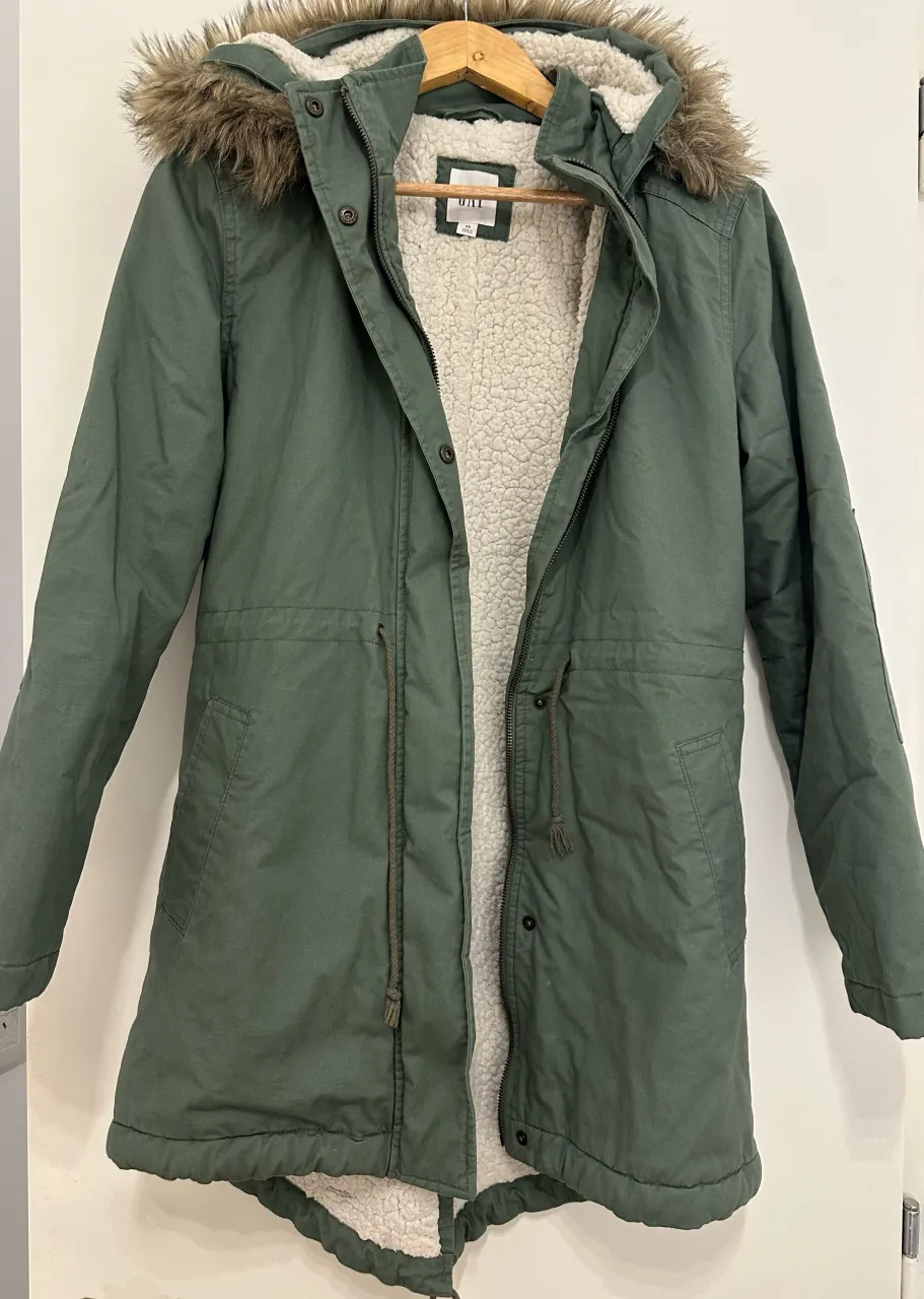 Parka verde con capucha forrada en piel sintética. Ideal para el frío, con cordones ajustables en la cintura y bolsillos frontales. Perfecta para un look casual y abrigado. Es XS, pero al ser un modelo largo y grande, un S también puede ser