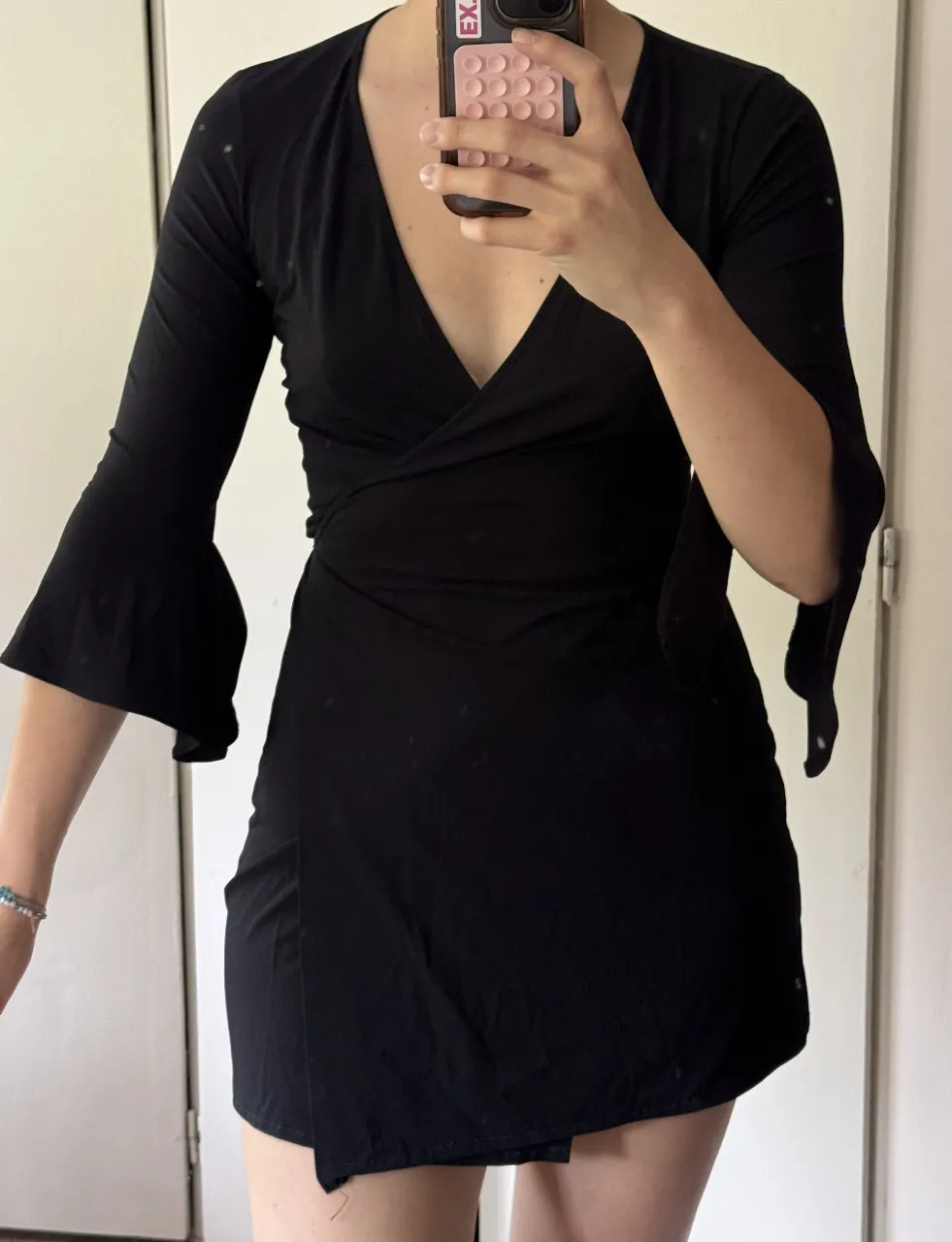 Vestido negro cruzado con mangas acampanadas. Ideal para una salida o una fiesta. La parte del ruedo esta descocida. lo hice a mano y se salio. Es talle XS pero va bien para M. La tela es tipo elastizada esta muy buena.