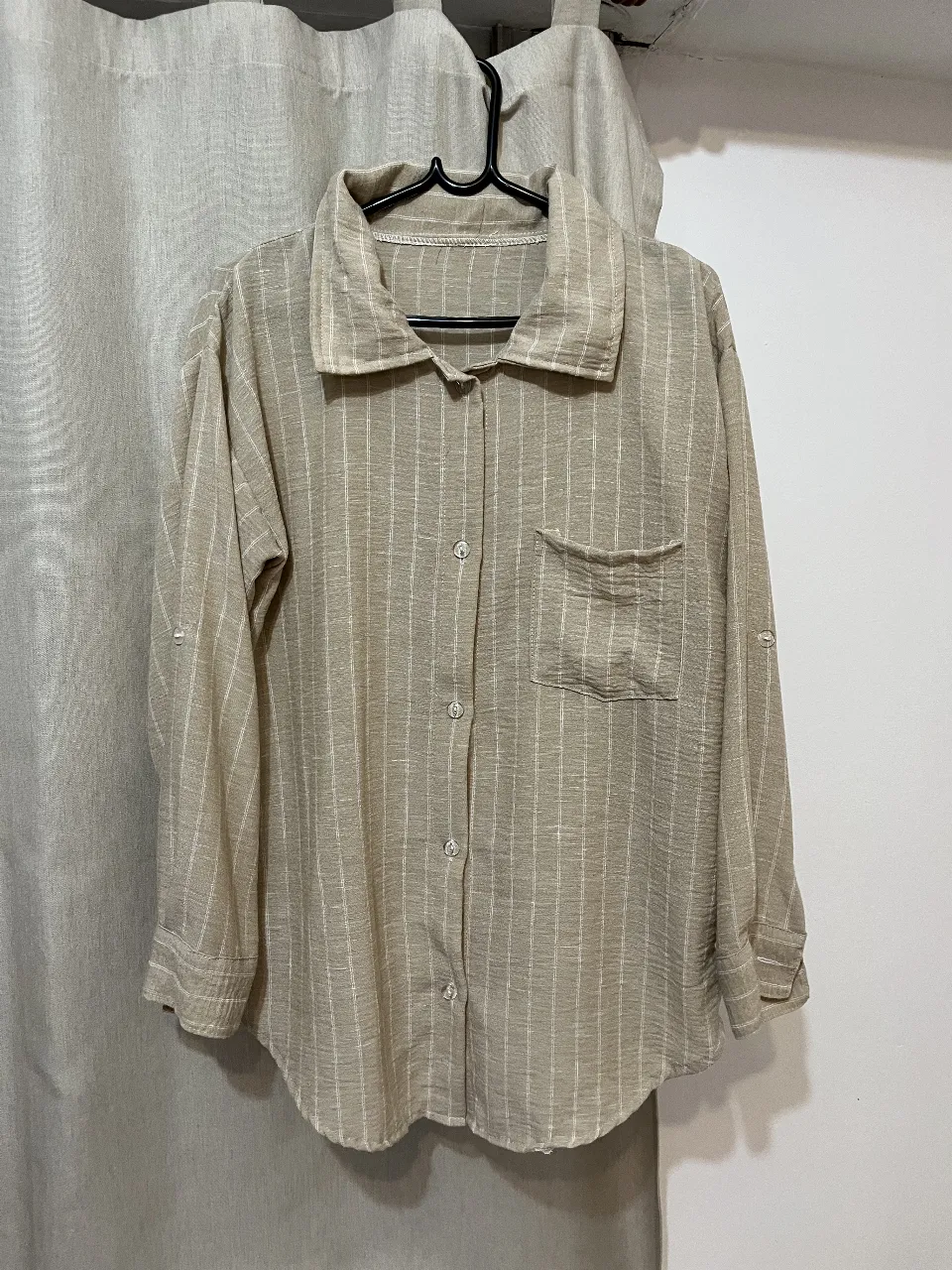 Camisa rayada, manga larga, con botones al frente y bolsillo en el pecho. Talle 40.