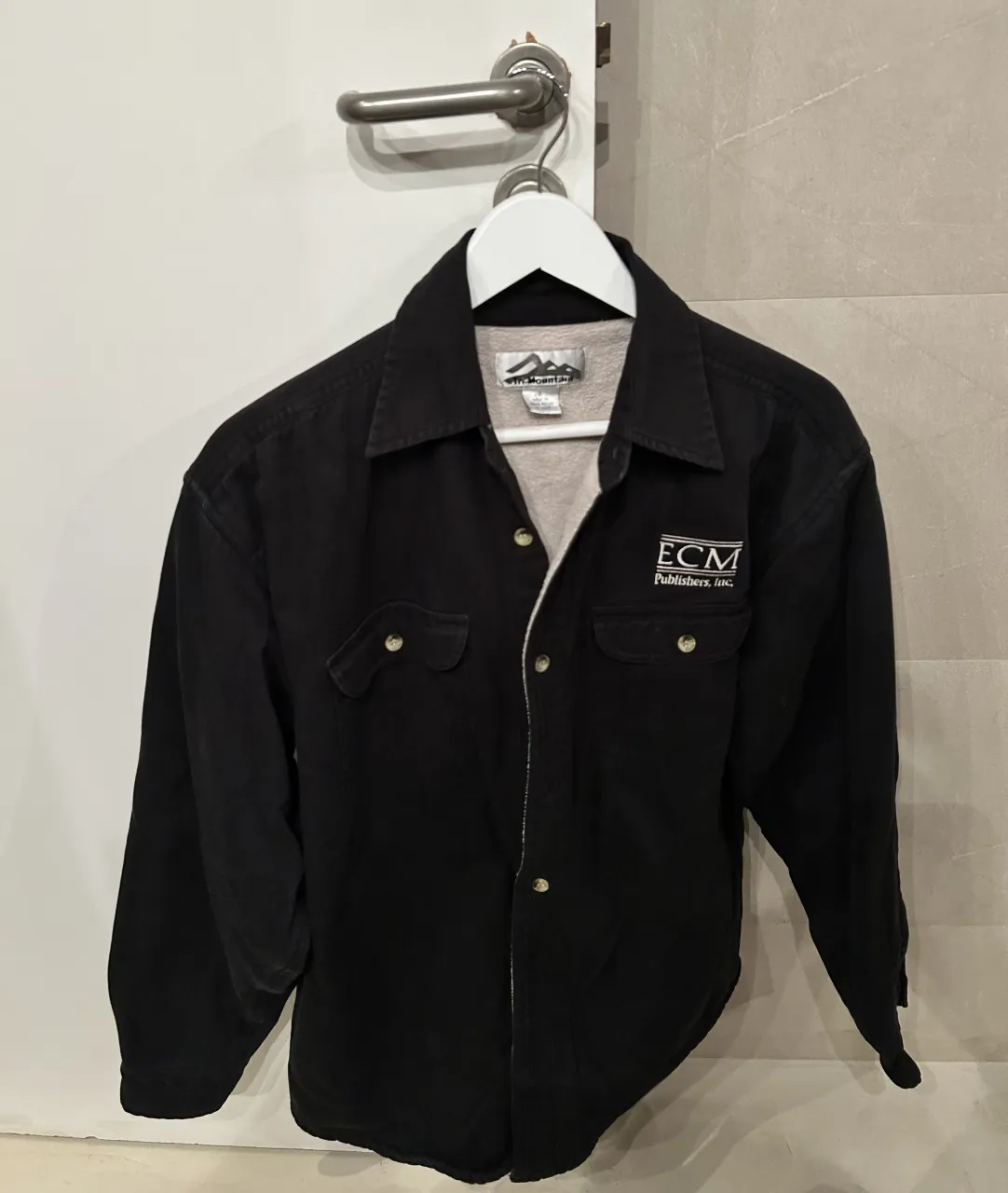 Campera negra con interior de corderito. Tiene dos bolsillos en el frente con botones y un bordado en el pecho izquierdo con las siglas "ECM Publishers, Inc.".