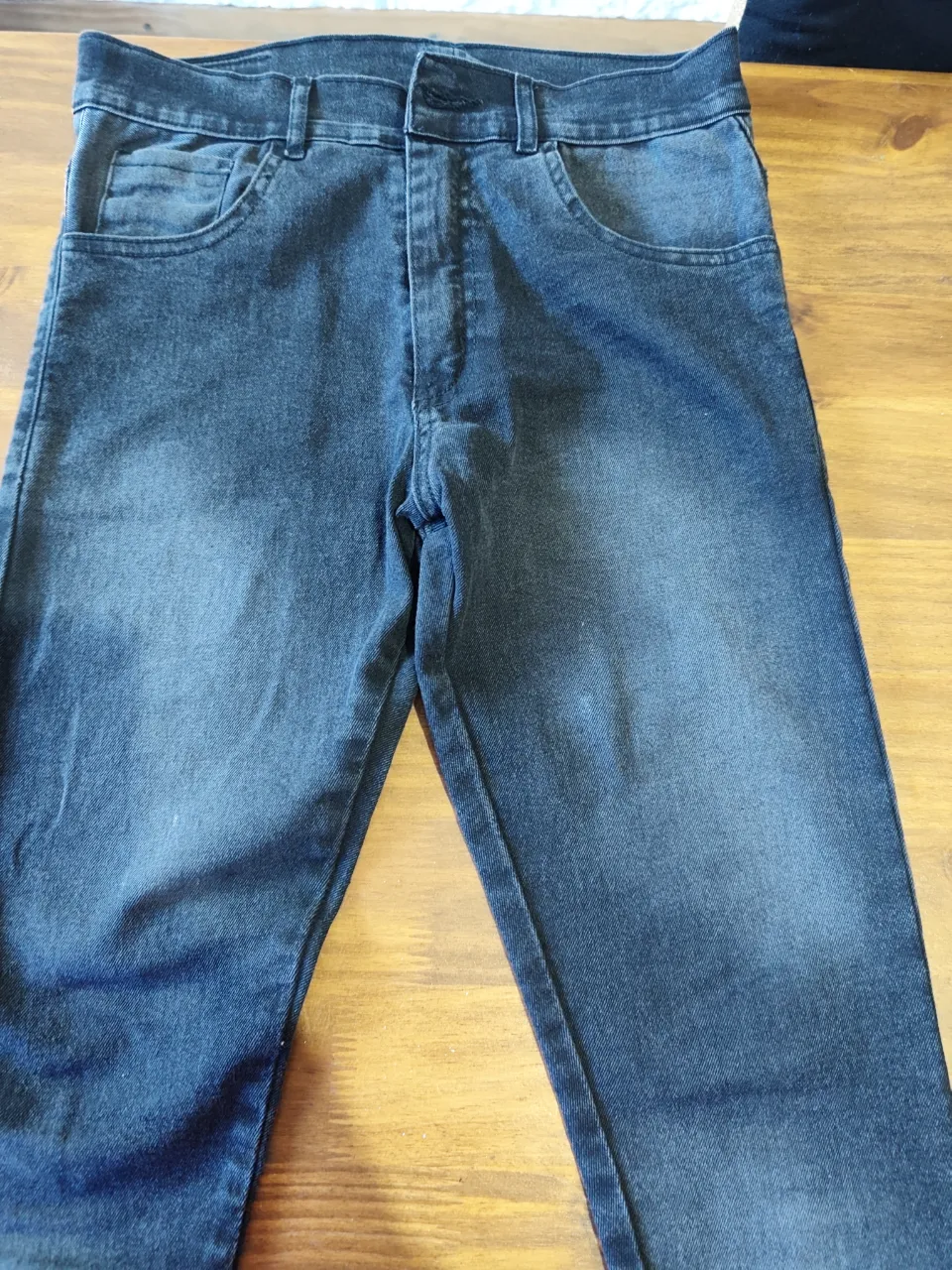 Jeans de corte clásico en color negro con efecto desgastado, chupín, Presentan bolsillos frontales y traseros. poco uso.