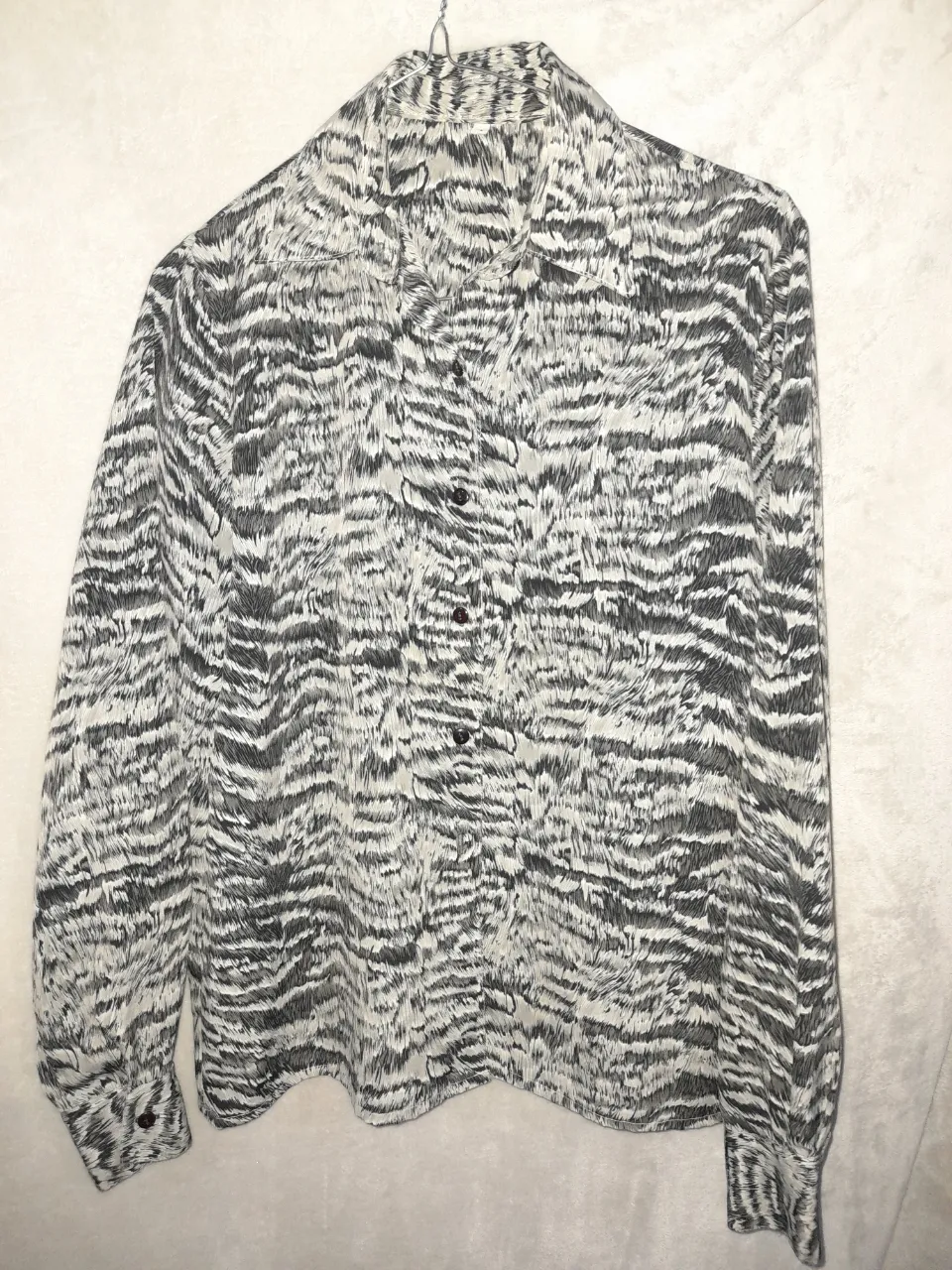 Camisa estampada con diseño de rayas en blanco y negro. Posee cuello, manga larga con puño y botones al frente.