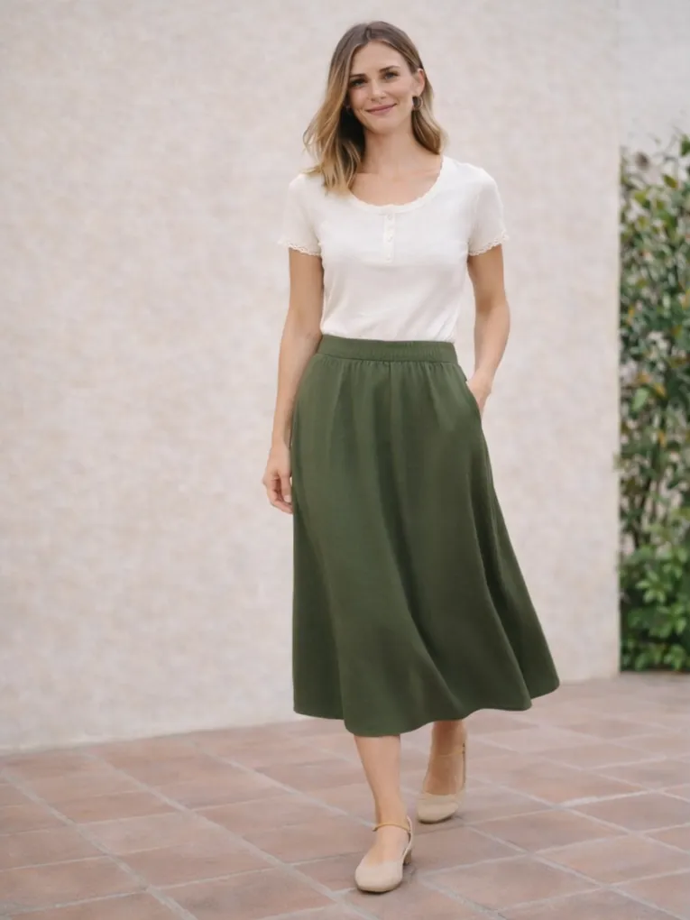 Pollera importada larga verde seco de tela liviana, ideal para el día a día. Posee cintura elastizada atrás y pretina adelante, además bolsillos laterales. Combina perfecto con remeras, blusas y también tejido liviano y botinetas para media estación.