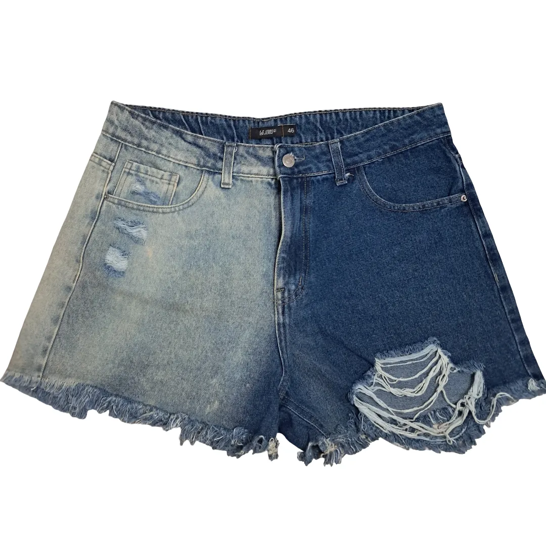 Shorts de jean tiro alto, con roturas y deshilachados. Diseño de dos tonos, uno más claro y otro más oscuro, que le da un toque moderno y canchero. Ideales para un look casual y descontracturado.