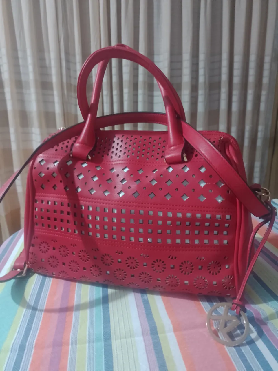 Bolso rojo de cuero sintético con detalles calados y apliques metálicos. Tiene dos asas cortas y una correa larga desmontable. Ideal para el día a día o para un look casual chic.