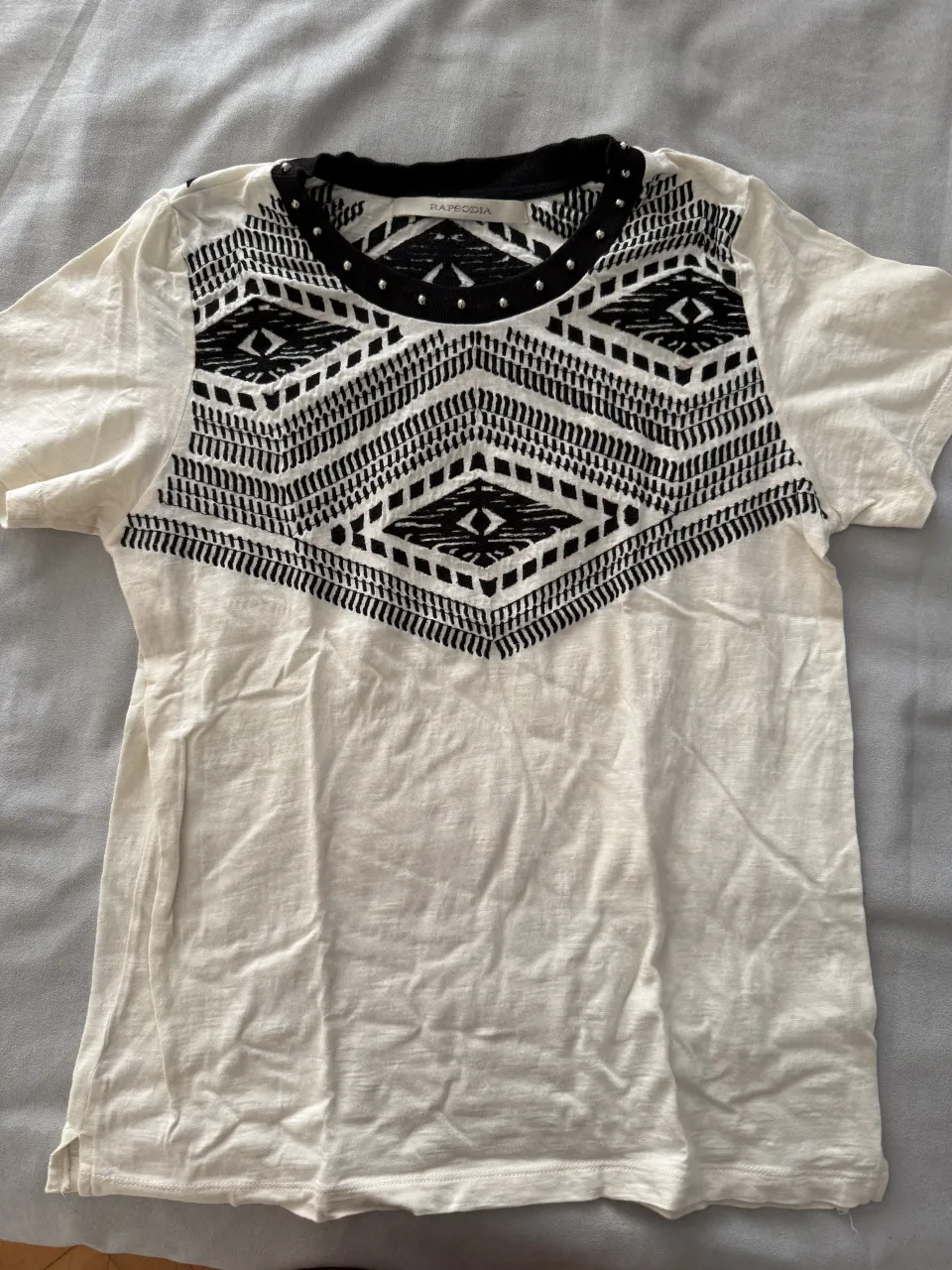 Remera blanca con estampa geométrica en negro en la parte superior. Cuello redondo con tachas plateadas.