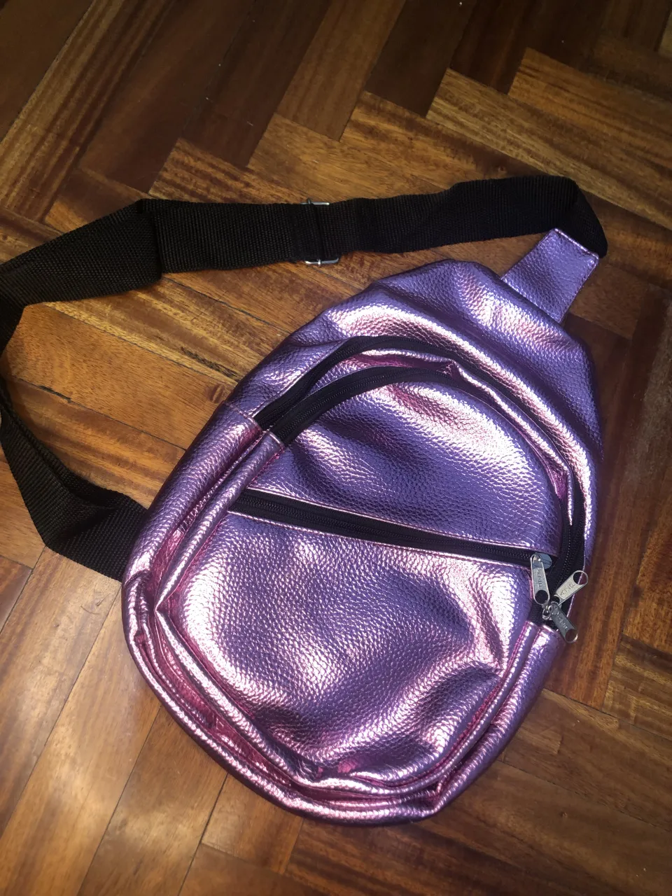 Mochila riñonera metálica color rosa holográfica con dos bolsillos frontales y uno interno. Correa ajustable negra. MEDIDAS: 34,5cm de alto 21cm de largo 9cm de ancho
