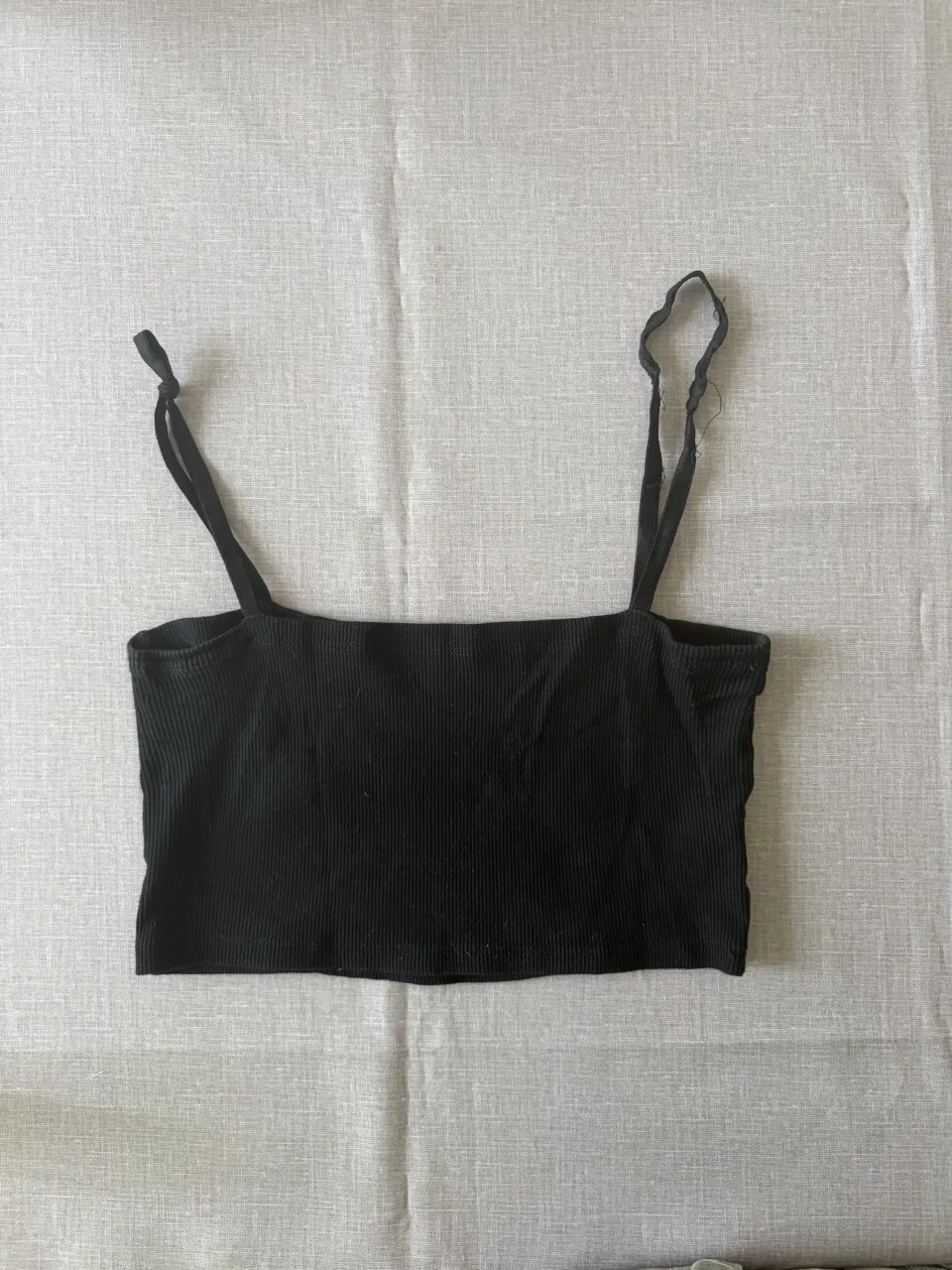 Top negro de morley con tiras finas. Ideal para usar solo o como base de un outfit.