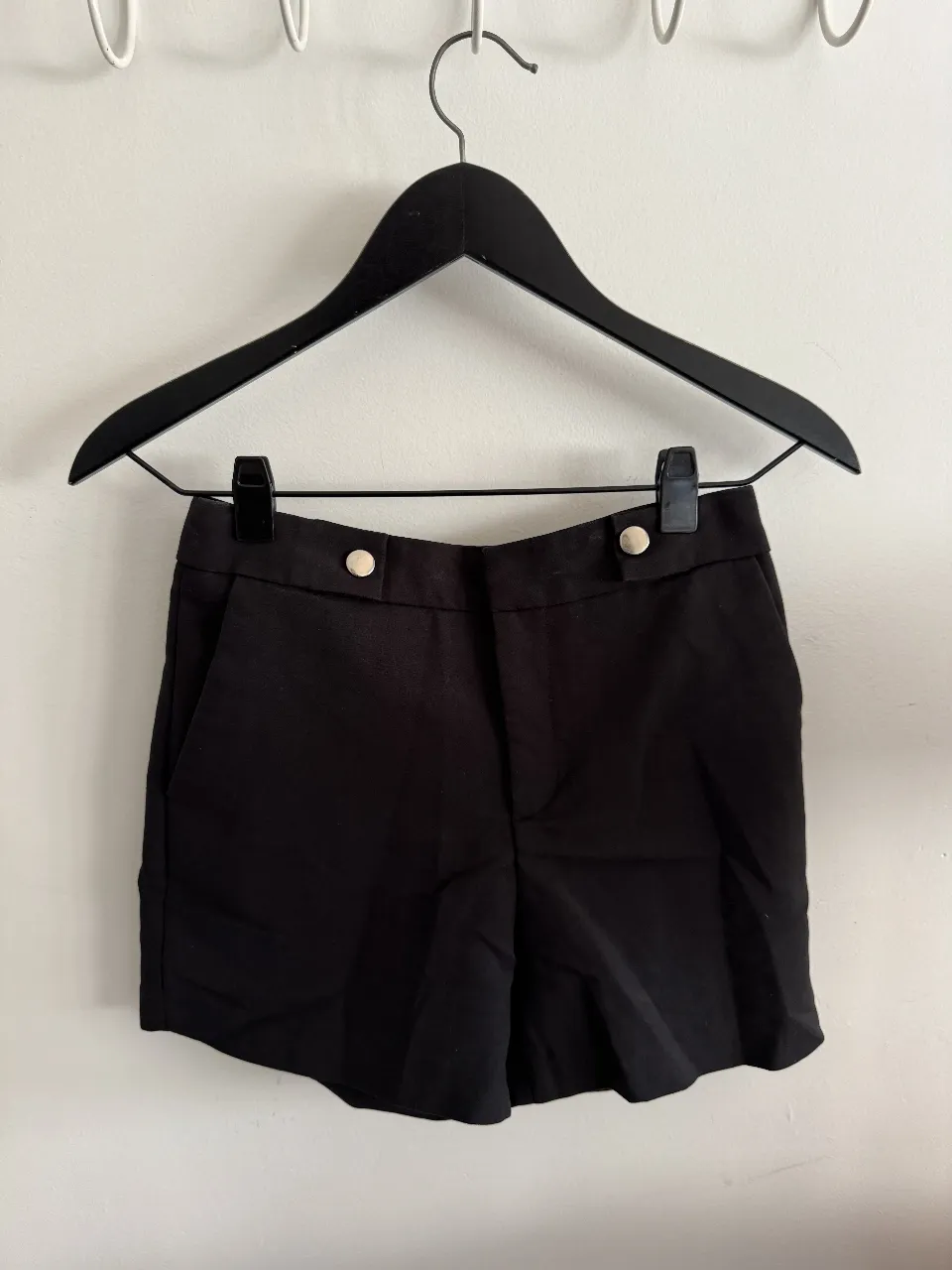 Shorts negros de vestir, tiro alto, con dos bolsillos delanteros y dos traseros (de mentira). Cierre con gancho y botón metálico. Ideales para un look elegante y sofisticado.
