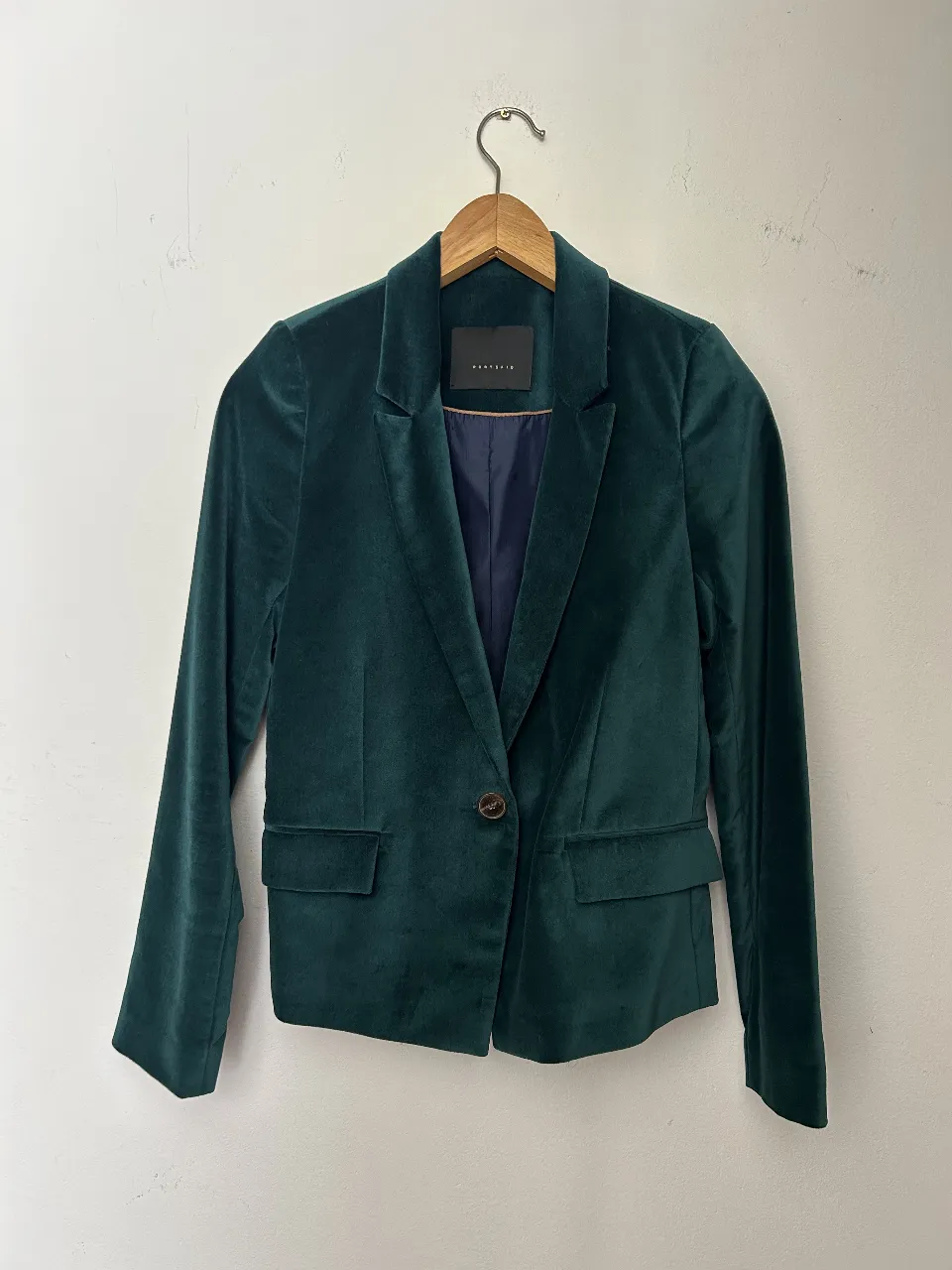 Blazer de terciopelo verde esmeralda, con un solo botón y bolsillos frontales. Ideal para un look elegante y sofisticado. Impecable estado. La verdad que lo vendo porque me queda chico, es una joya! Medidas aprox: Hombro a hombro: 37 cm Altura total: 58 cm Sisa: 39 cm Largo manga: 60 cm bolsillos falsos.