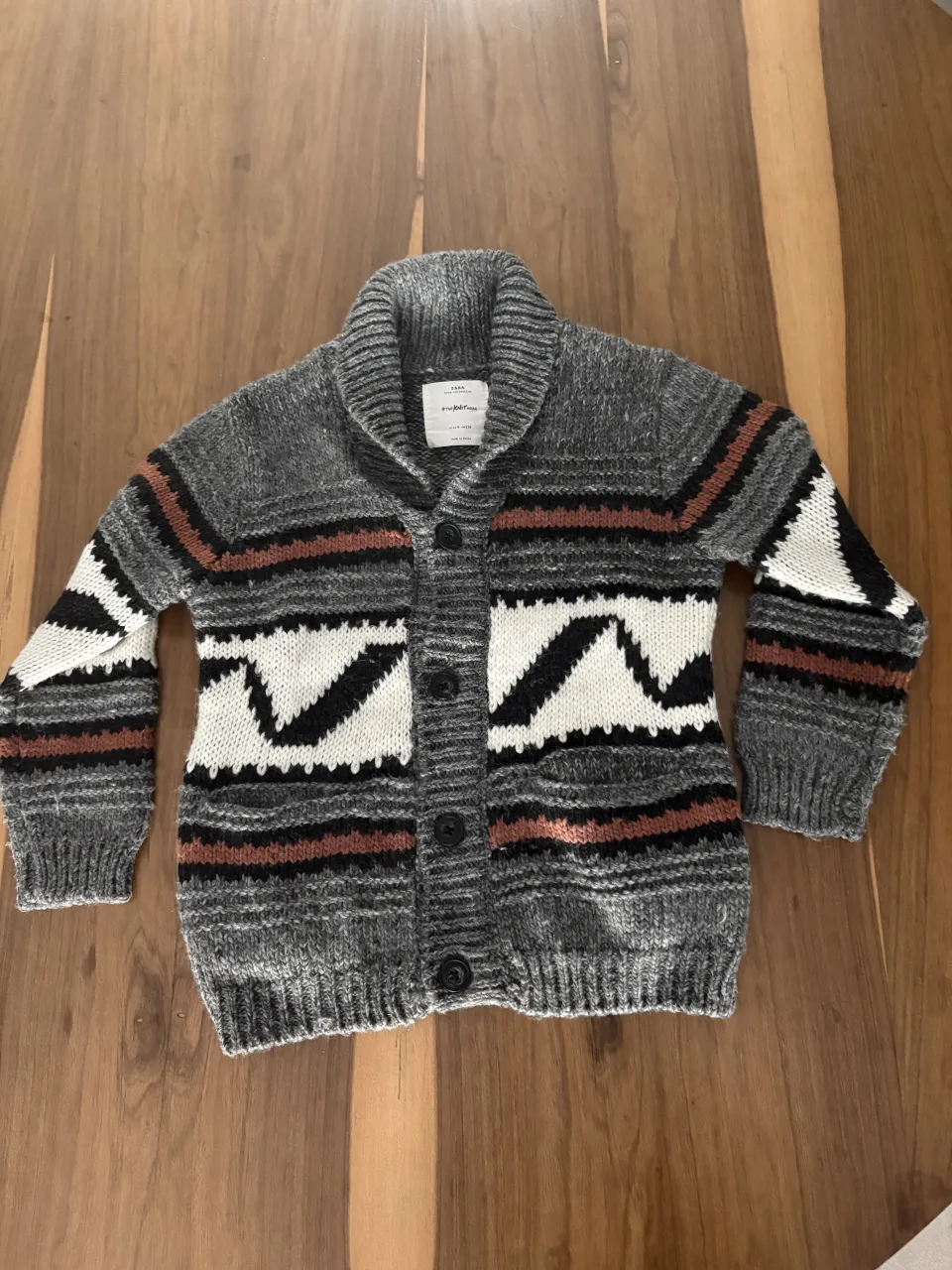 Cardigan de tejido grueso con diseño de rombos y rayas en tonos grises, blancos y terracota. Cuello solapa y botones al frente. Ideal para un look abrigado y con estilo.