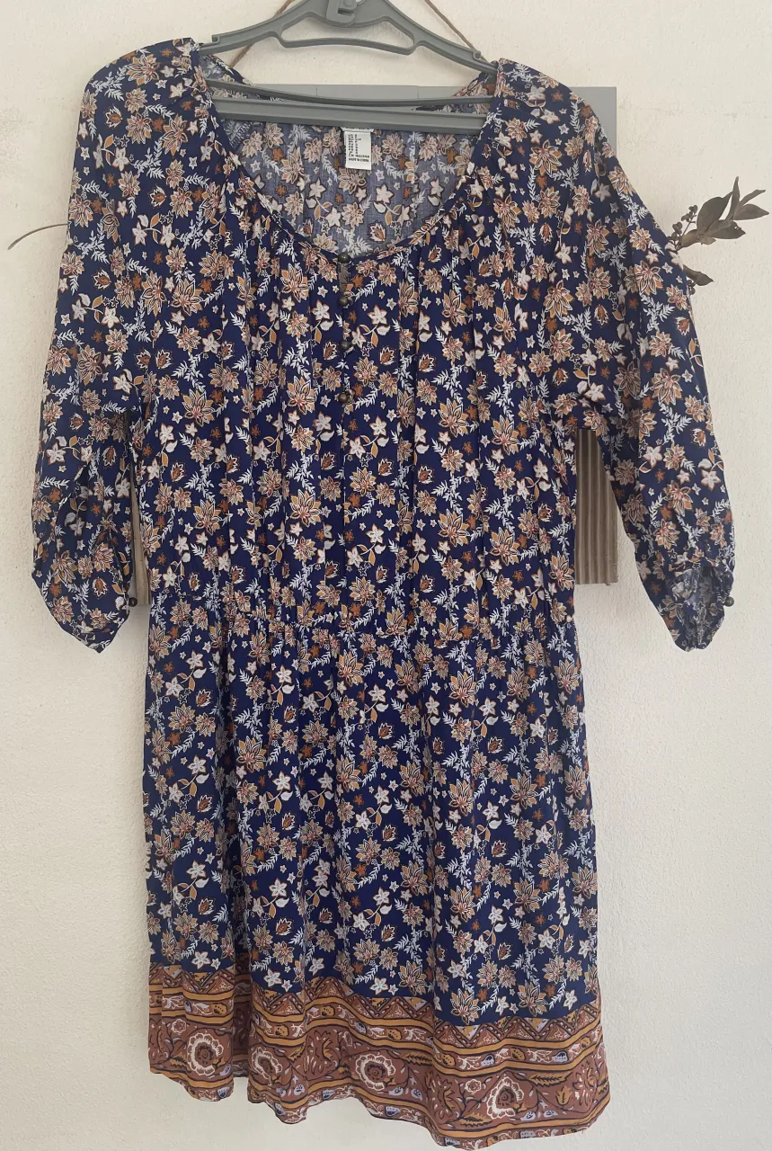 Vestido corto azul con estampado floral en tonos tierra y blanco. Posee mangas 3/4 con detalle de botones y un borde inferior con diseño étnico. Ideal para un look casual y fresco. Con forro en la parte inferior