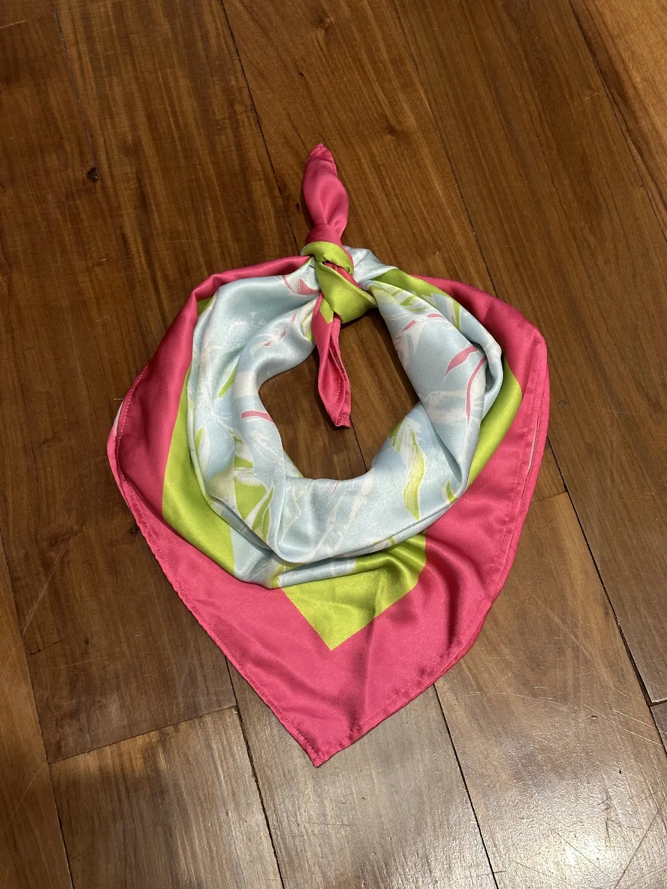 Pañuelo de seda con un estampado floral vibrante en tonos celestes, verdes y rosas. Ideal para darle un toque de color a cualquier outfit.