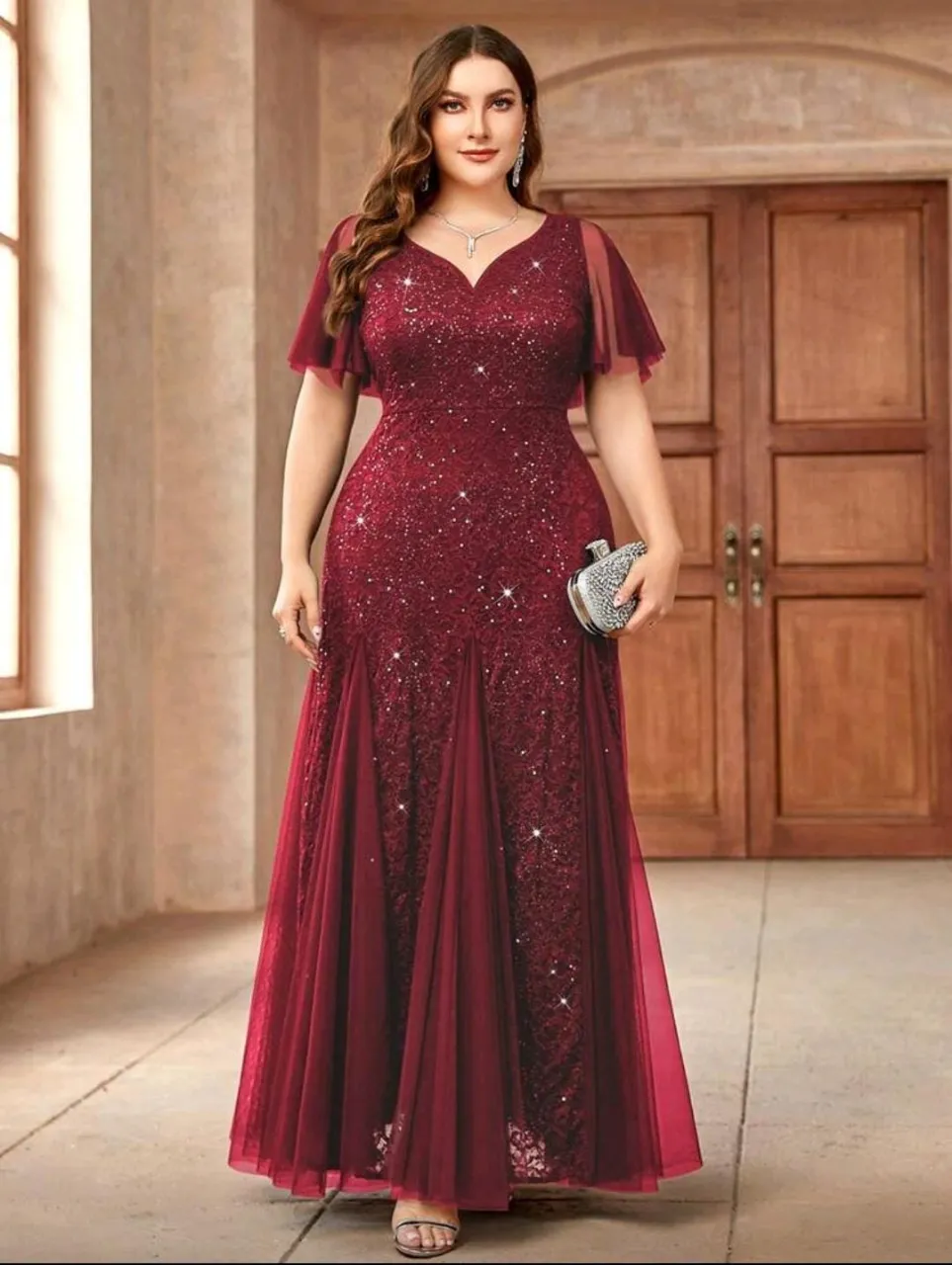 Vestido largo de fiesta en color bordó, con lentejuelas brillantes y detalles de encaje. Posee mangas cortas tipo mariposa y un escote en V pronunciado. Ideal para eventos formales y celebraciones.