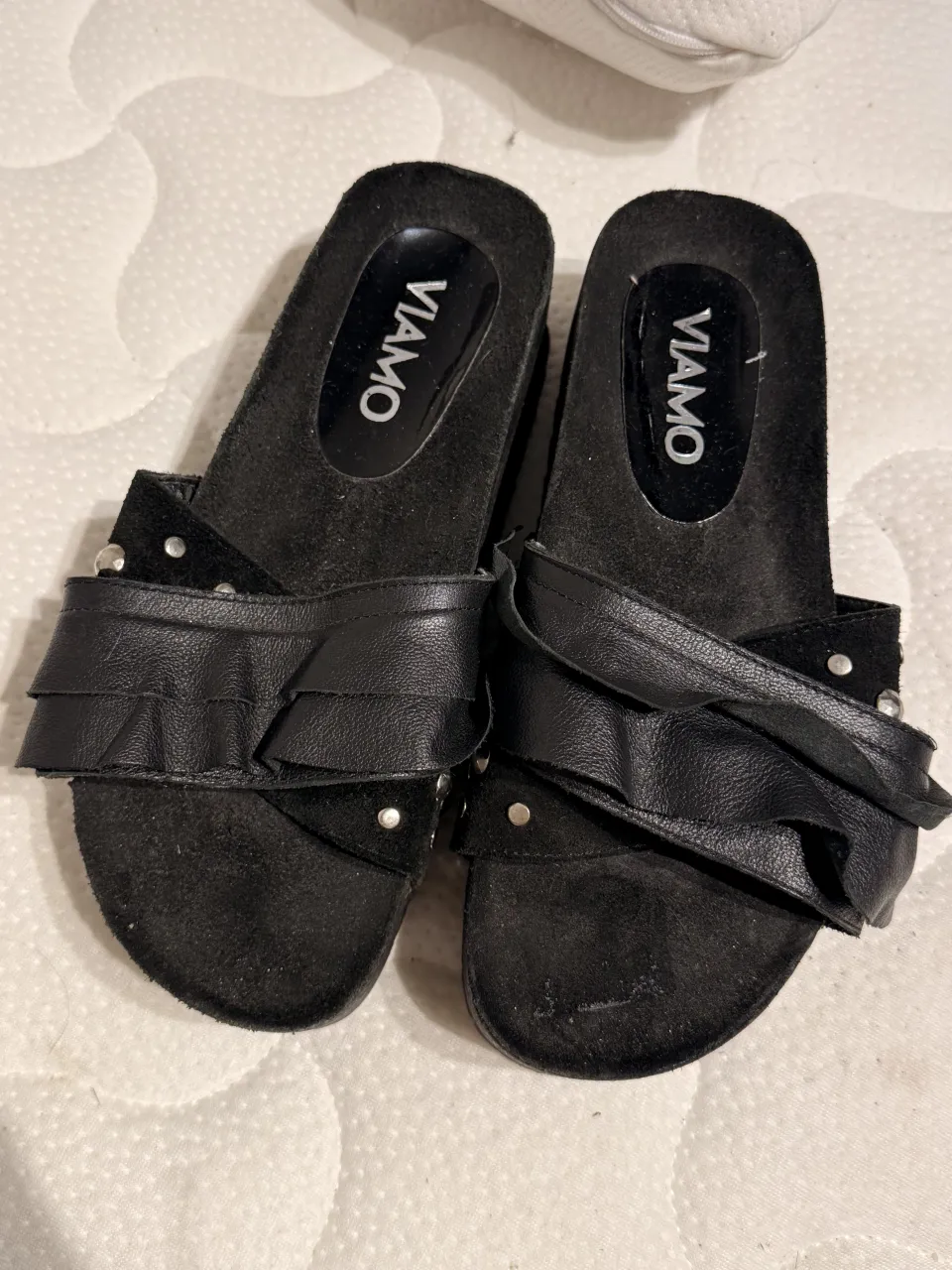 Sandalias negras con tiras de cuero con volados y tachas. Marca Viamo.