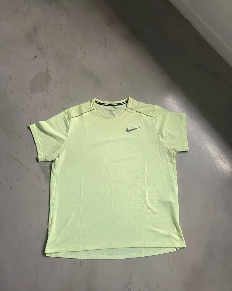 Remera deportiva de manga corta de color verde lima. Posee el logo de Nike bordado en el frente. Original, como nueva. Medidas: largo 70cm - hombros 45cm - axilas 57cm - bicep 24cm