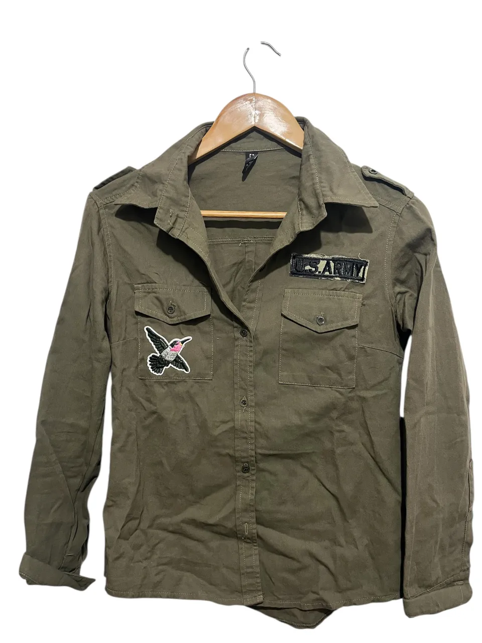 Camisa estilo militar color verde, con parches de "US ARMY" y un colibrí bordado. talle 36. Posee bolsillos frontales con botones y cuello camisero. Ideal para un look casual y canchero.