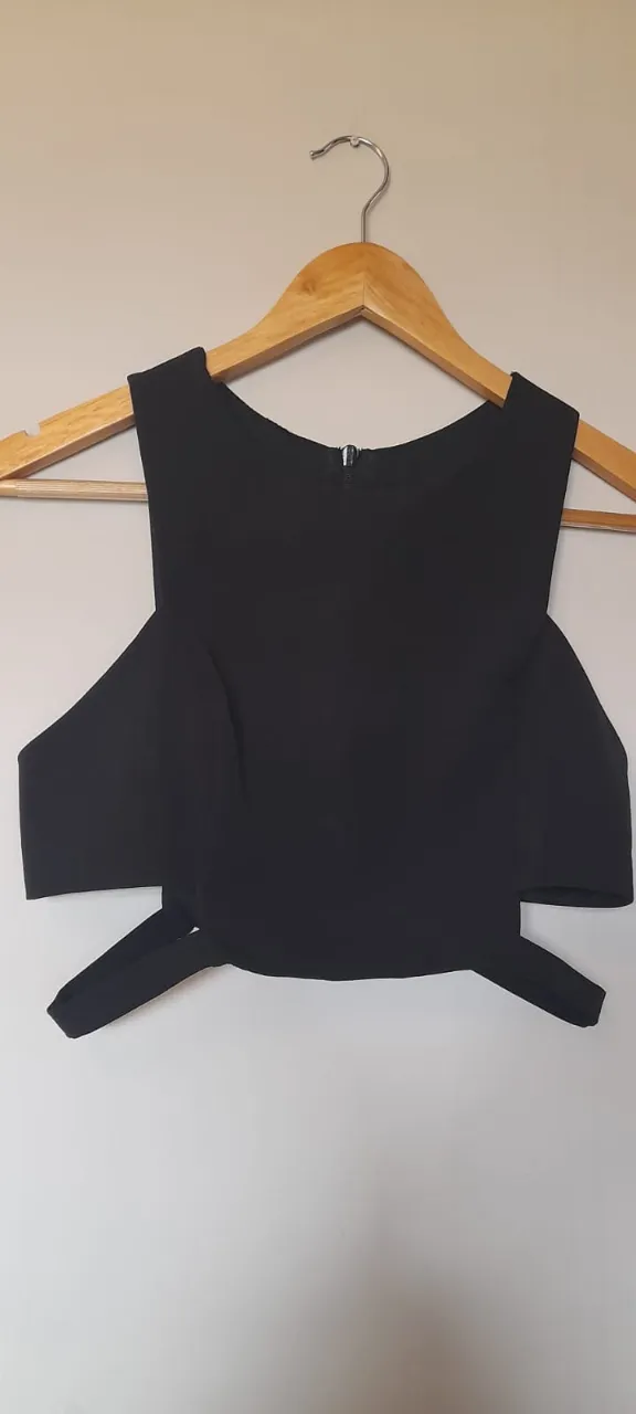 Top negro crop con tiras en la cintura y hombros descubiertos. Cierre en la espalda. Ideal para salidas nocturnas o eventos.