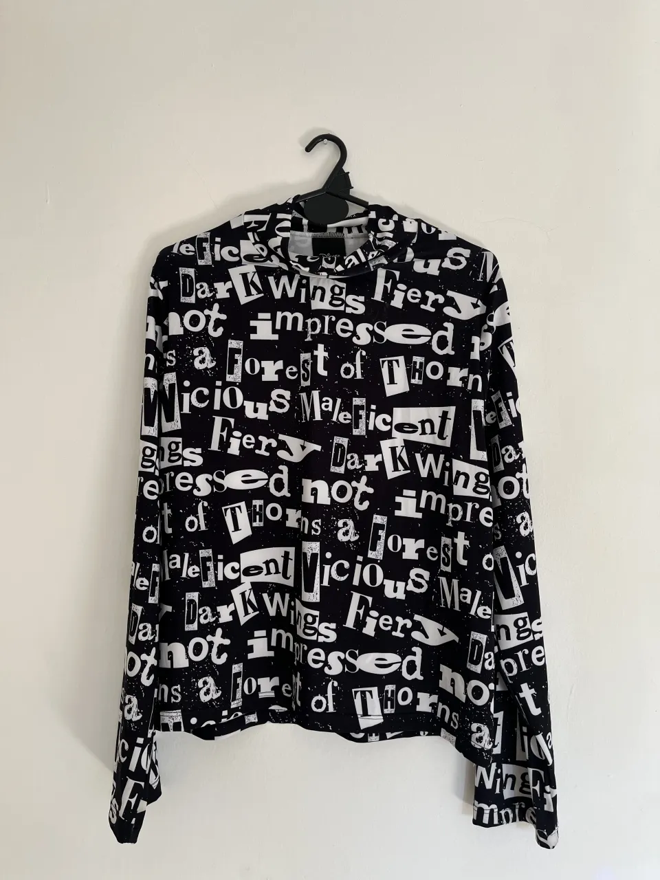Remera manga larga negra con estampa de letras blancas estilo collage. Diseño único y llamativo, ideal para un look urbano y moderno. Perfecta para quienes buscan destacar con un estilo audaz.