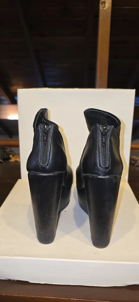 Botinetas negras de cuero con plataforma alta y taco cuña. Cierre en la parte trasera (solo talón )